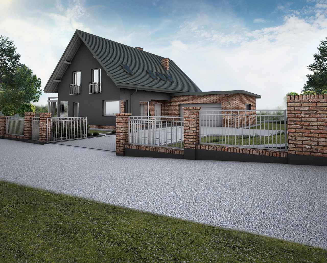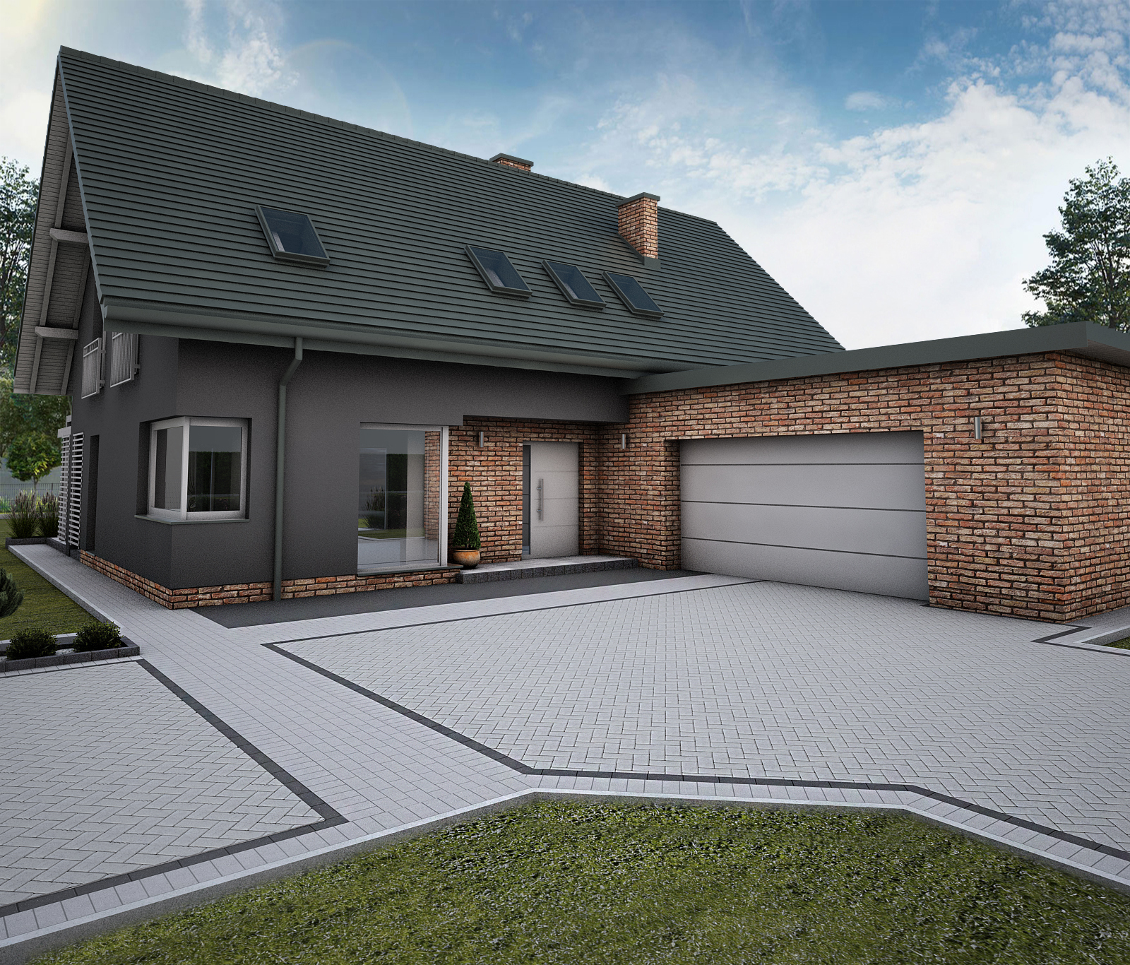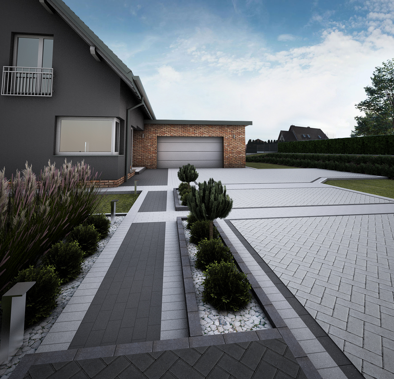 Celem projektu było stworzenie nawierzchni idealnie dopasowanej do bryły budynku, utrzymanej w odcieniach grafitu i cegły.