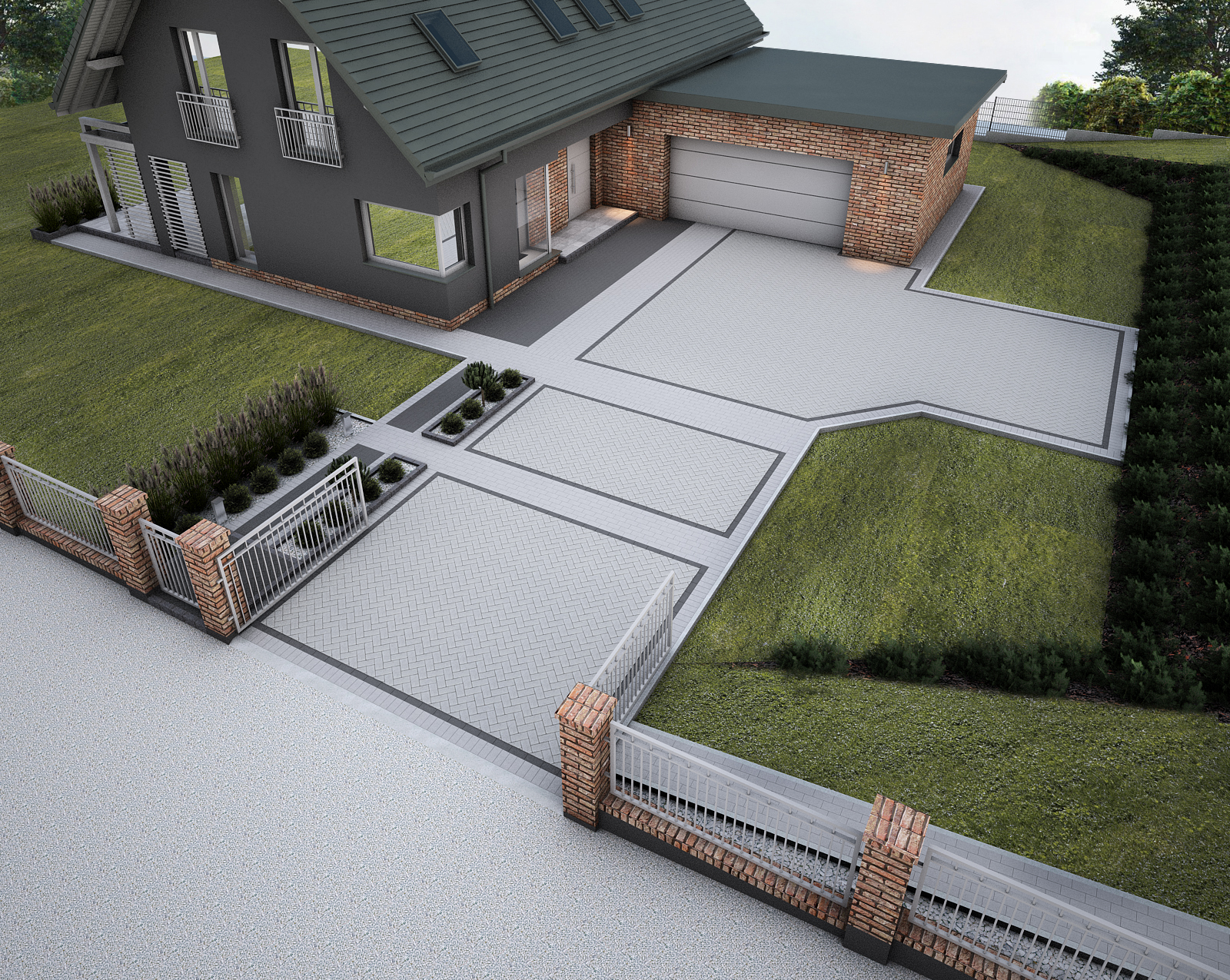 Projekt wykonano w skali 1:100, obejmując pełną koncepcję 2D i wizualizację 3D. Z dokładnym rozplanowaniem układu kostki, obrzeży, spadków i odwodnienia.