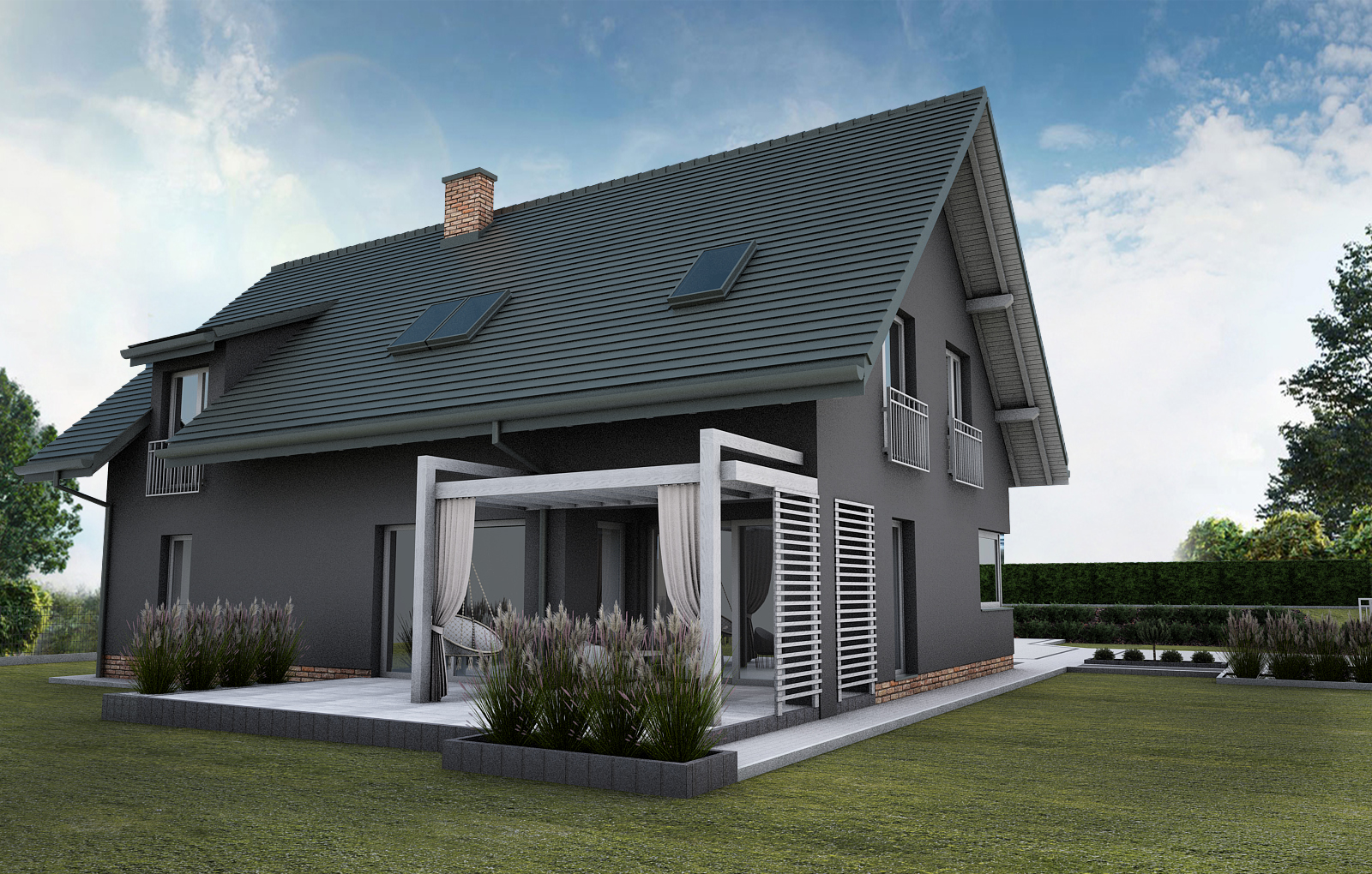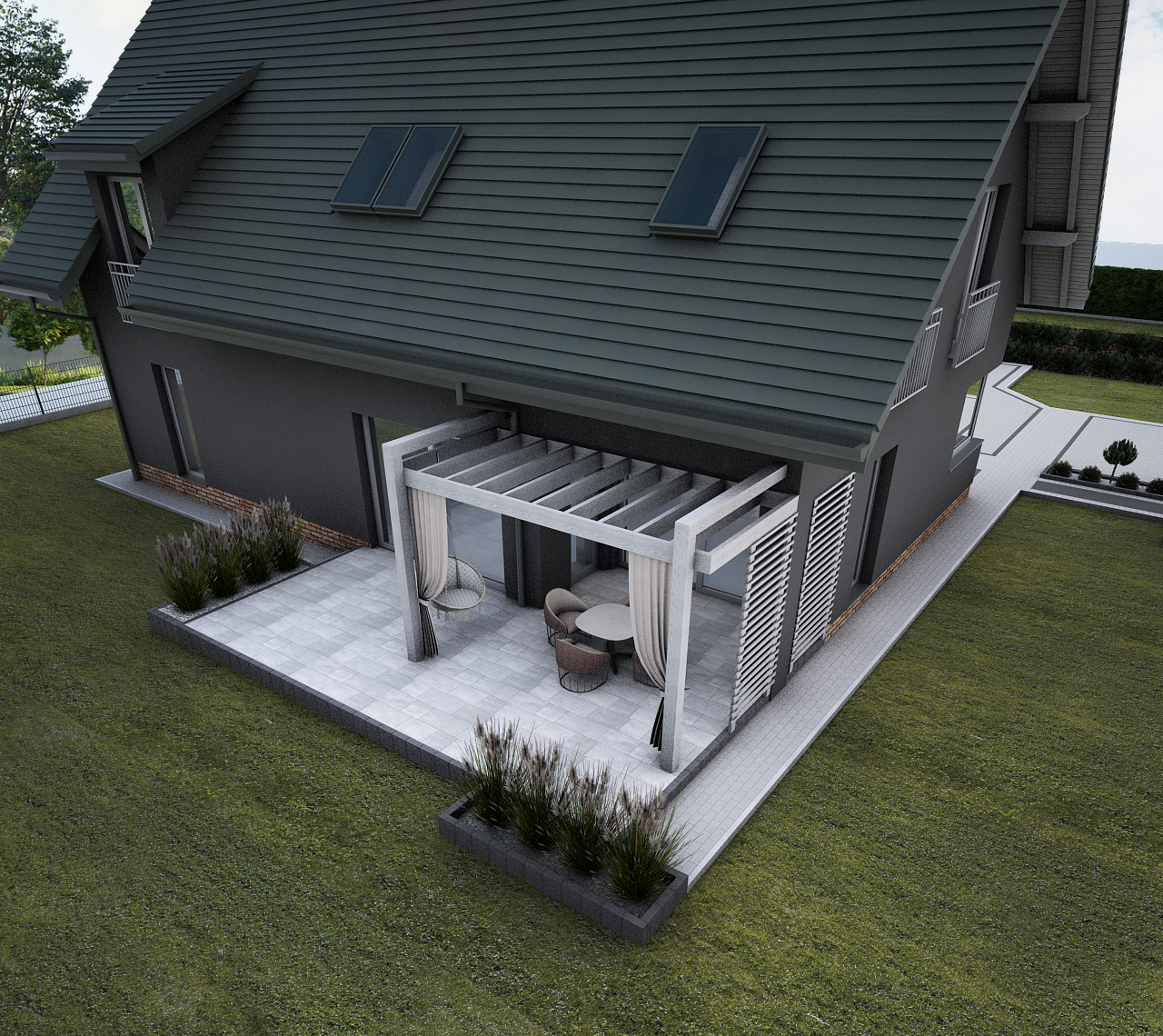 Zadaszona pergola z lamelami i tkaninami nadaje przestrzeni lekkości i prywatności. Rabaty z traw ozdobnych oraz nasadzenia zimozielone oddzielone palisadą Zen uzupełniają kompozycję. Wypełnienie z białego grysu dodaje elegancji i kontrastu.